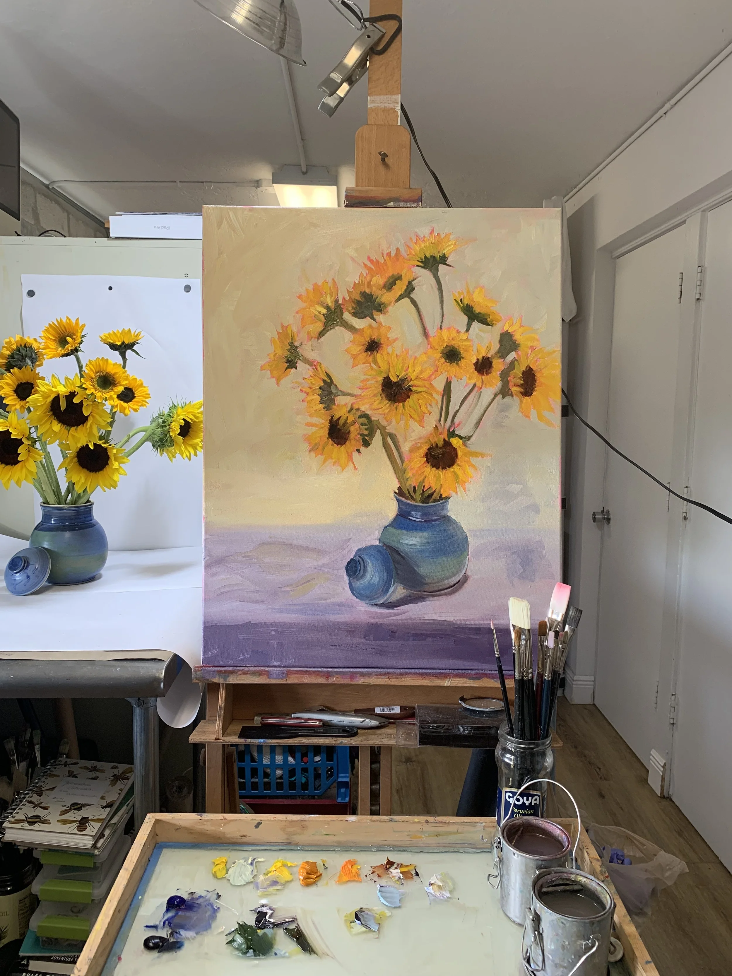 This oil painting was completed in 2019 as a challenge to myself. If you look at the first image of the fresh flowers in a vase, the petals and their textures are many. Where does one start? Flowers, background, or vase. After the block in stage, I went directly to the flowers unraveling shapes and colors. If you look closely, there are more brush strokes and less detail. That means this painting falls into impressionistic it gives the viewer an idea of the subject. For this type of painting I was pleased to have accomplished the similarities.