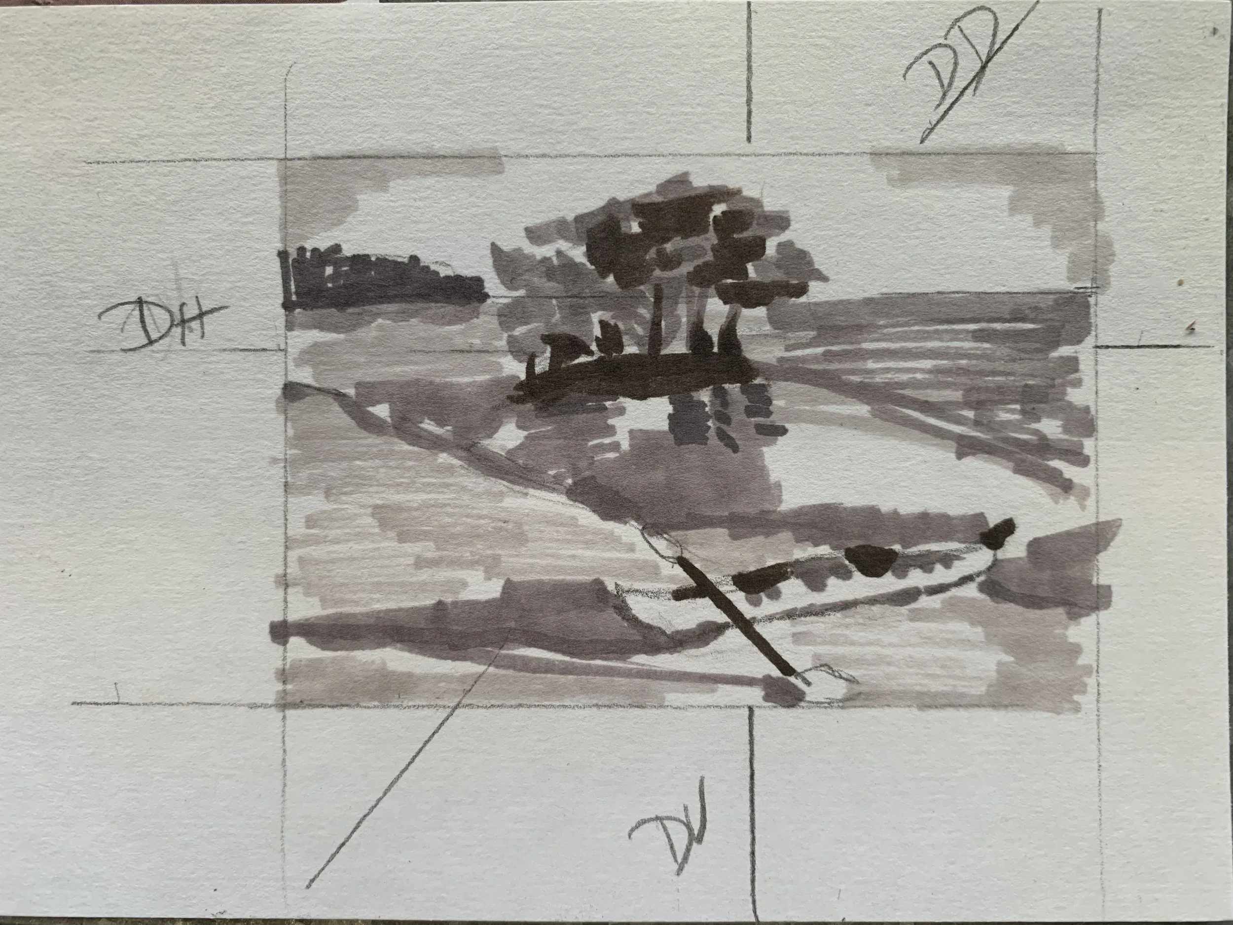 Before embarking on a painting the process of a value study is like training of the brain in the detail and aspects that can be chosen for the completion of this type of exercise. It is easy on paper to add, delete or change something before the oils hit the canvas.