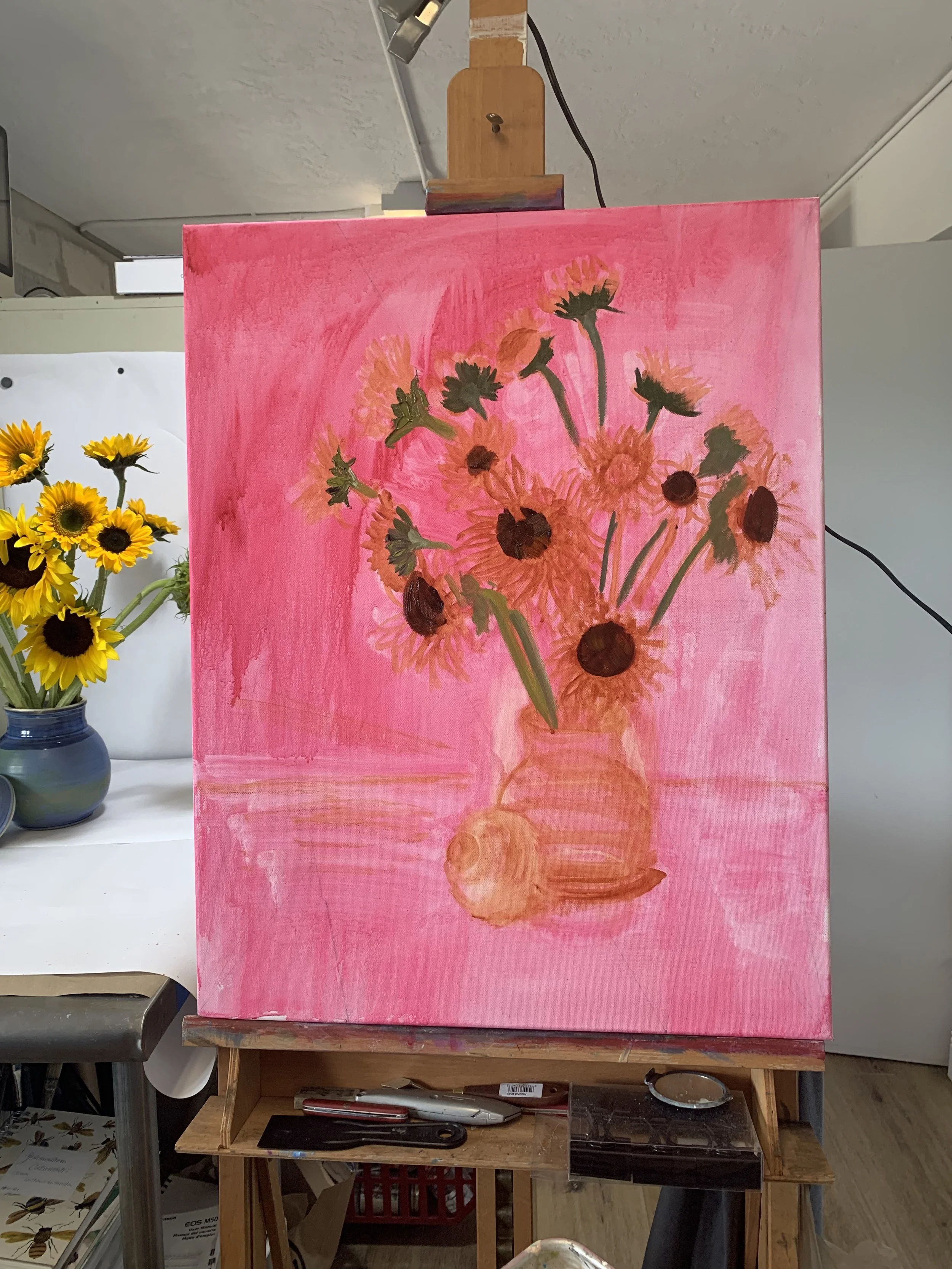 After a painting is complete, back to the studio for observation and drying time. The sun in this painting is so bright as in the memory of this day on many different levels. The only obvious title for this painting is “Pascal’s Sunshine”.