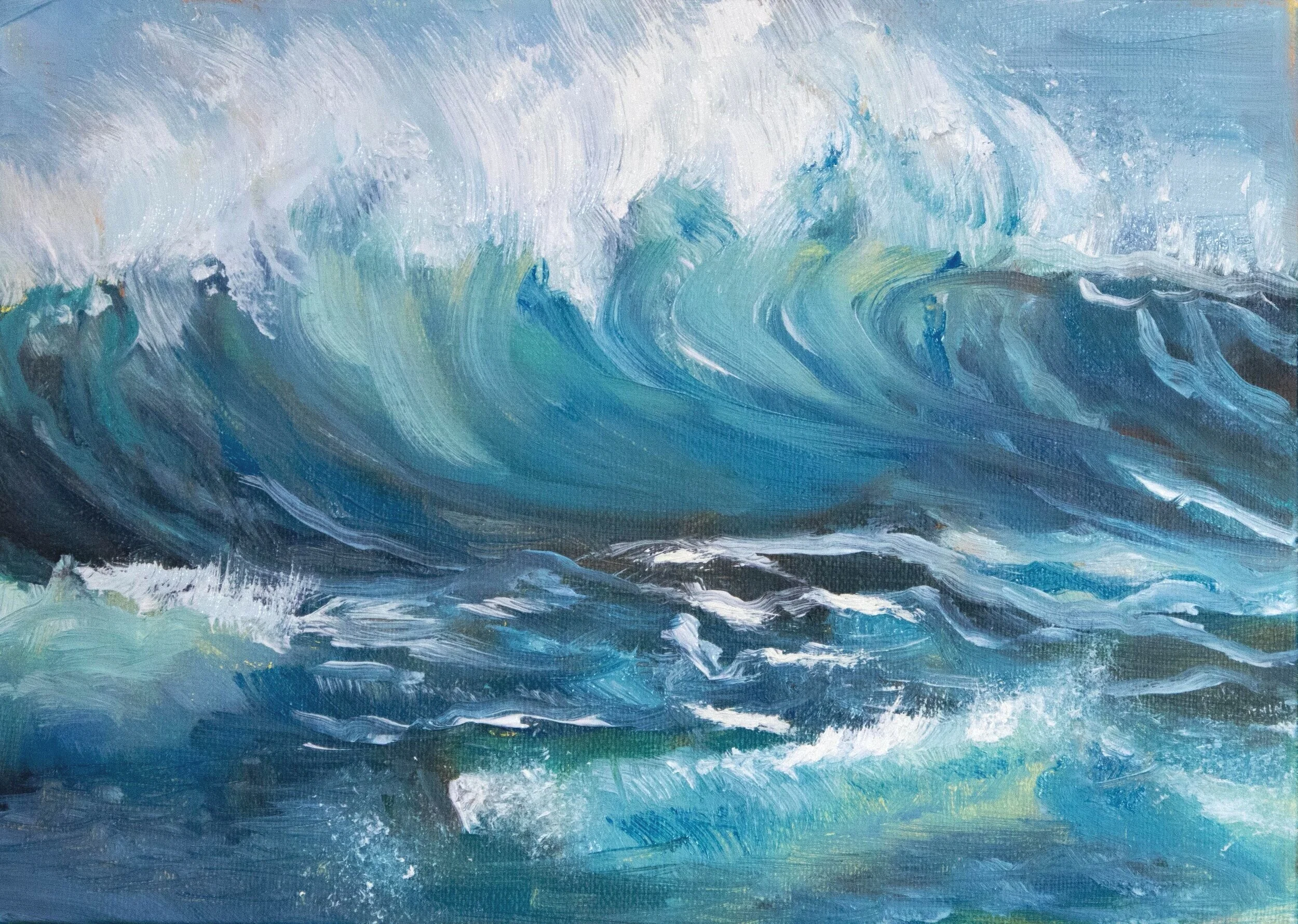 This painting is the 6th out of 10. Wave paintings in a small study series in oils. The painting is on a 5” x 7” panel. Translucent colors in waves show the light shining through the thin top of the wave just before it turns into a downward motion. With the same effect happening in the foreground waves.